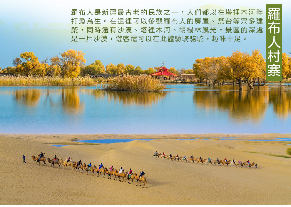 【羅布人村寨(含騎駱駝)+仙女湖+請吃烤魚】是一處羅布人居住的世外桃源,寨區涵蓋塔克拉瑪干沙漠、遊移湖泊、塔里木河、原始胡楊林、草原和羅布人。最大沙漠、最長的內陸河、最大的綠色走廊和絲綢之路在這裏交匯,形成了黃金品質的天然景觀。