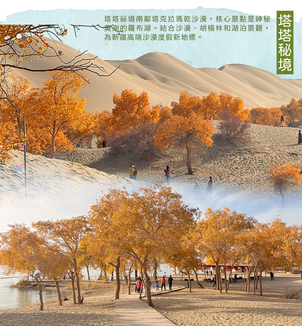 【塔塔秘境(含景區車)】是位於中國新疆巴音郭楞蒙古自治州尉犁縣的一處大型沙漠生態旅遊度假區,以塔克拉瑪干沙漠、羅布湖、胡楊林和西域文化體驗為主,特色是「沙水相依」的壯闊景觀。