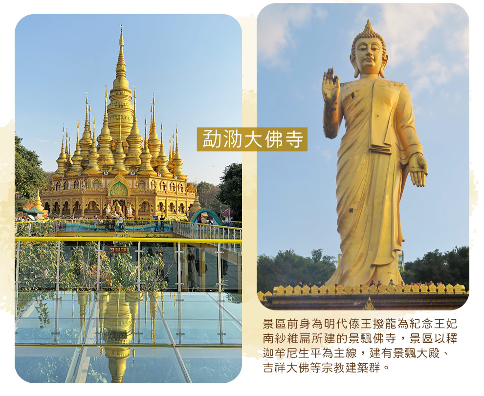【大佛寺(含電瓶車)】大佛寺是在古代傣王朝的皇家寺院“景飄佛寺”的原址上恢復重建的。景區以佛祖釋迦牟尼的生平及佛寺活動為主線,巧妙融入到景觀及建築群體中,充分展示南傳佛教的歷史與傳統文化色彩。