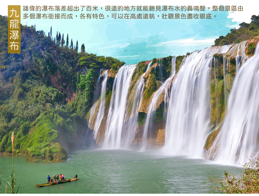 【九龍瀑布群】當地布依族稱之為「大疊水」。瀑布群長4千米,最大一級瀑布被稱為「神龍瀑」,是羅平古十景之一的“三峽懸流”所在地,也是雲南省最寬、最大的瀑布。