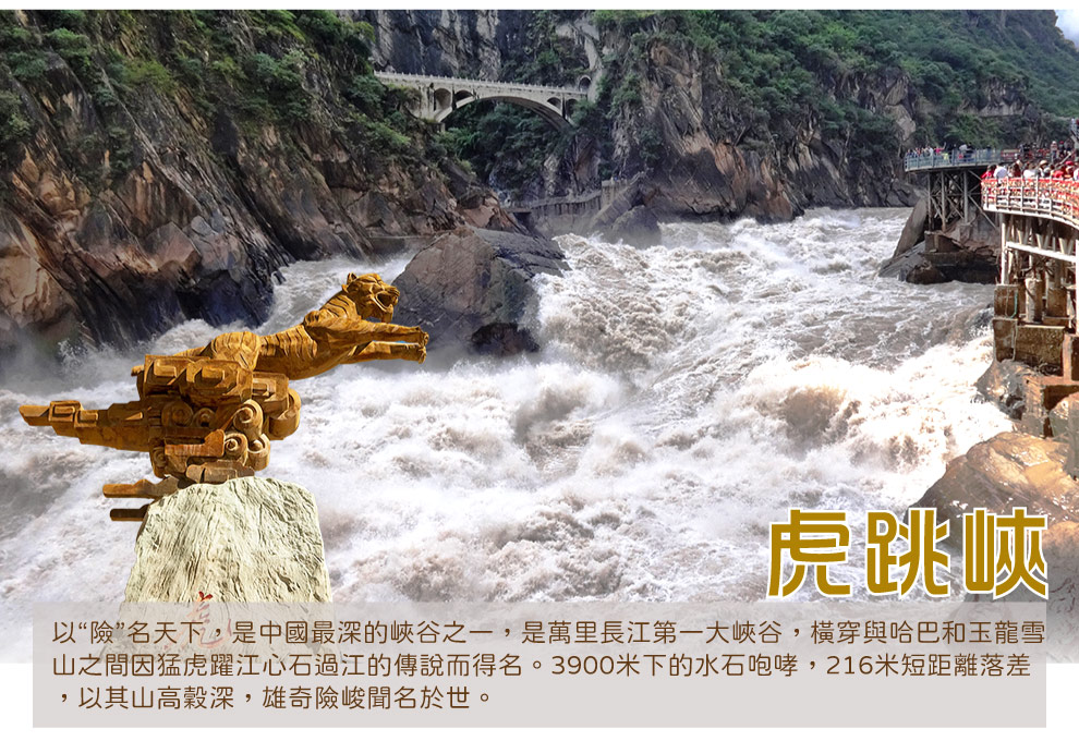 【虎跳峽景區(含上下行電梯)】虎跳峽景區南岸為玉龍雪山,主峯海拔高達5596米,北岸哈巴雪山海拔5396米。受兩岸高山的緊緊束縛,江流入峽後寬僅50多米,最窄處虎豹一躍即過,故名虎跳峽。峽谷距離麗江市市區80千米,峽谷在金沙江上游,全長17千米,迂迴道路25千米,峽谷垂直高差3900多米,是世界上最深的峽谷之一。曾因山崩截流,今巨石遺留,致使水勢更加洶湧。