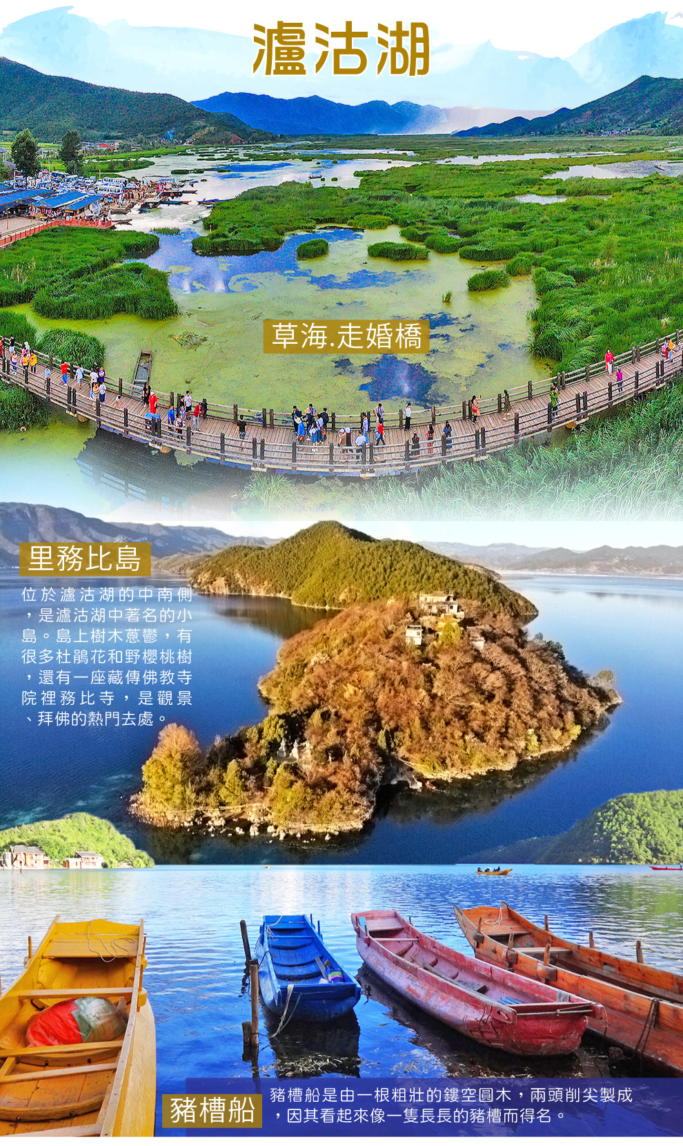 【瀘沽湖環湖遊】瀘沽湖是摩梭族的居住地,也是《西遊記》裡女兒國的原型。自古以來,摩梭族就是以女性為中心的母系氏族,瀘沽湖因此有了「女兒國」的美譽,也是世界上僅存的母系社會。