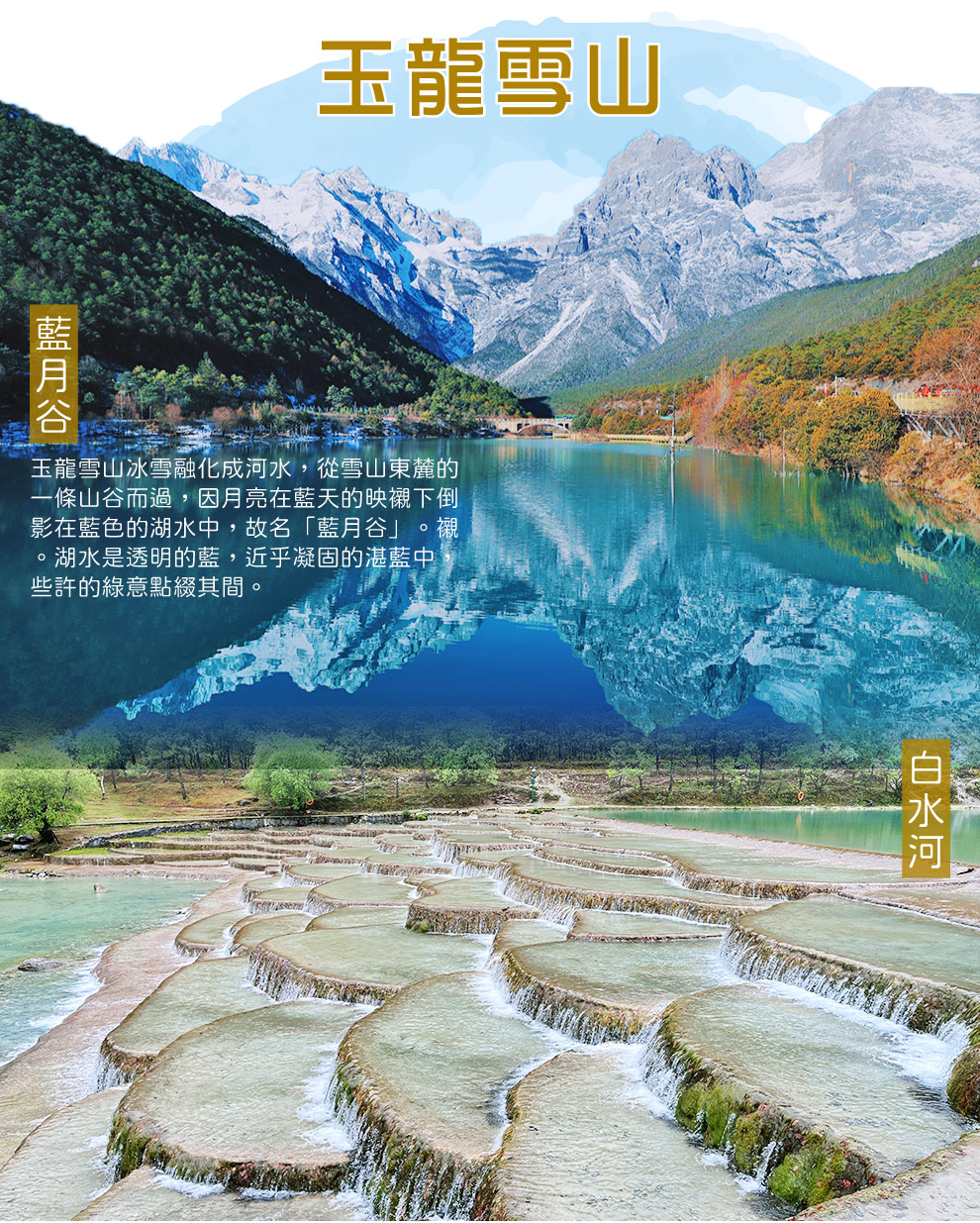 麗江: 玉龍雪山-雲杉坪(纜車上下,含環保車) →甘海子→白水河+ 藍月谷(含電瓶車)→私房景點