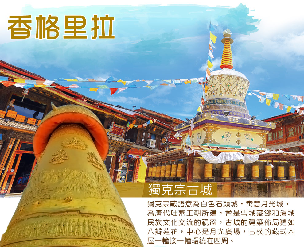 【獨克宗古城】為唐代吐蕃王朝所建。古城依山而建,路面就地勢鋪築石板,自然起伏。廣場西側是大龜山,又稱龜山公園,龜山頂上有載入吉尼斯世界紀錄的世界最大轉經筒,要三個人一起用力才能轉動。