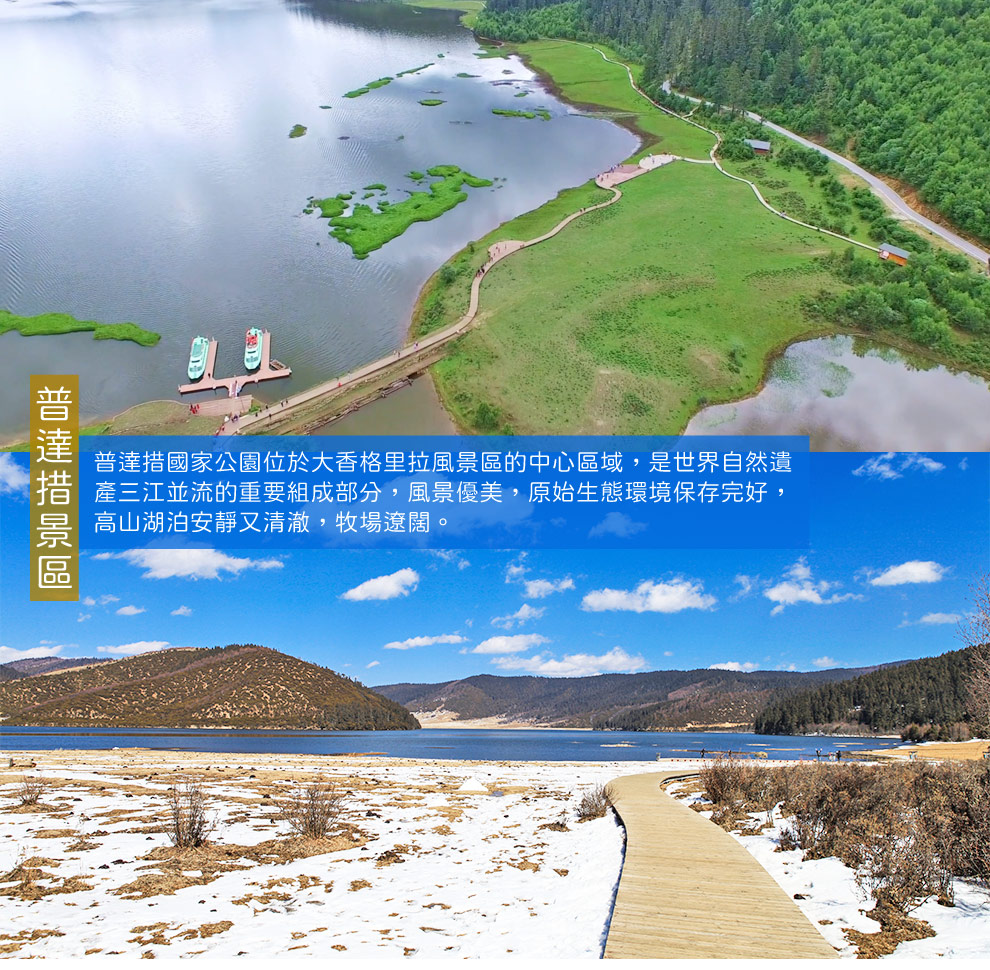 【普達措國家公園(含環保車)】位於大香格里拉風景區的中心區域,是世界自然遺產「三江並流」風景區的重要組成部分,主要由碧塔海、屬都湖和霞給民俗生態文化村三部分組成。公園內風景優美,原始生態環境保存完好,既有明鏡般的高山湖泊、水美草豐的牧場,也有百花盛開的濕地和茂密的原始森林。