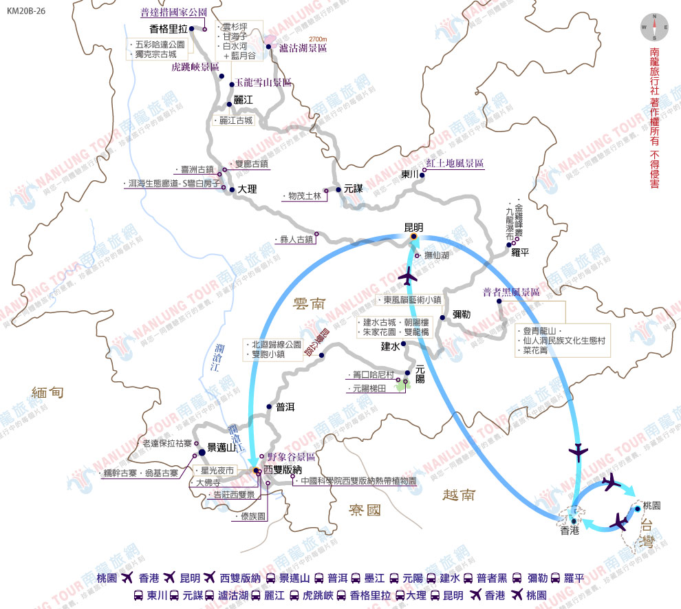桃園→香港(CI/CX/BR)→昆明(此為參考航班,航空公司/航班/時間可能會有所變動。正確搭乘航班時間,以出發前最終確認為主。)