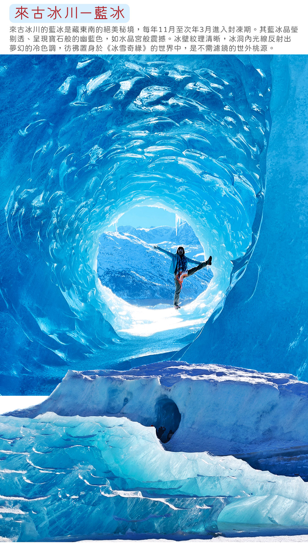 【來古冰川-藍冰】來古冰川是西藏昌都市八宿縣然烏鎮境內的一組冰川統稱,緊鄰然烏湖,為帕隆藏布江源頭,由美西、亞隆、若驕、東嘎、雄加和牛馬冰川組成,冰川融水注入然烏湖,周邊分佈原始森林與藏族村落,來古村藏語意為“隱藏的世外桃源”,村前冰湖因地質差異呈現不同顏色,部分湖面漂浮冰山景觀。