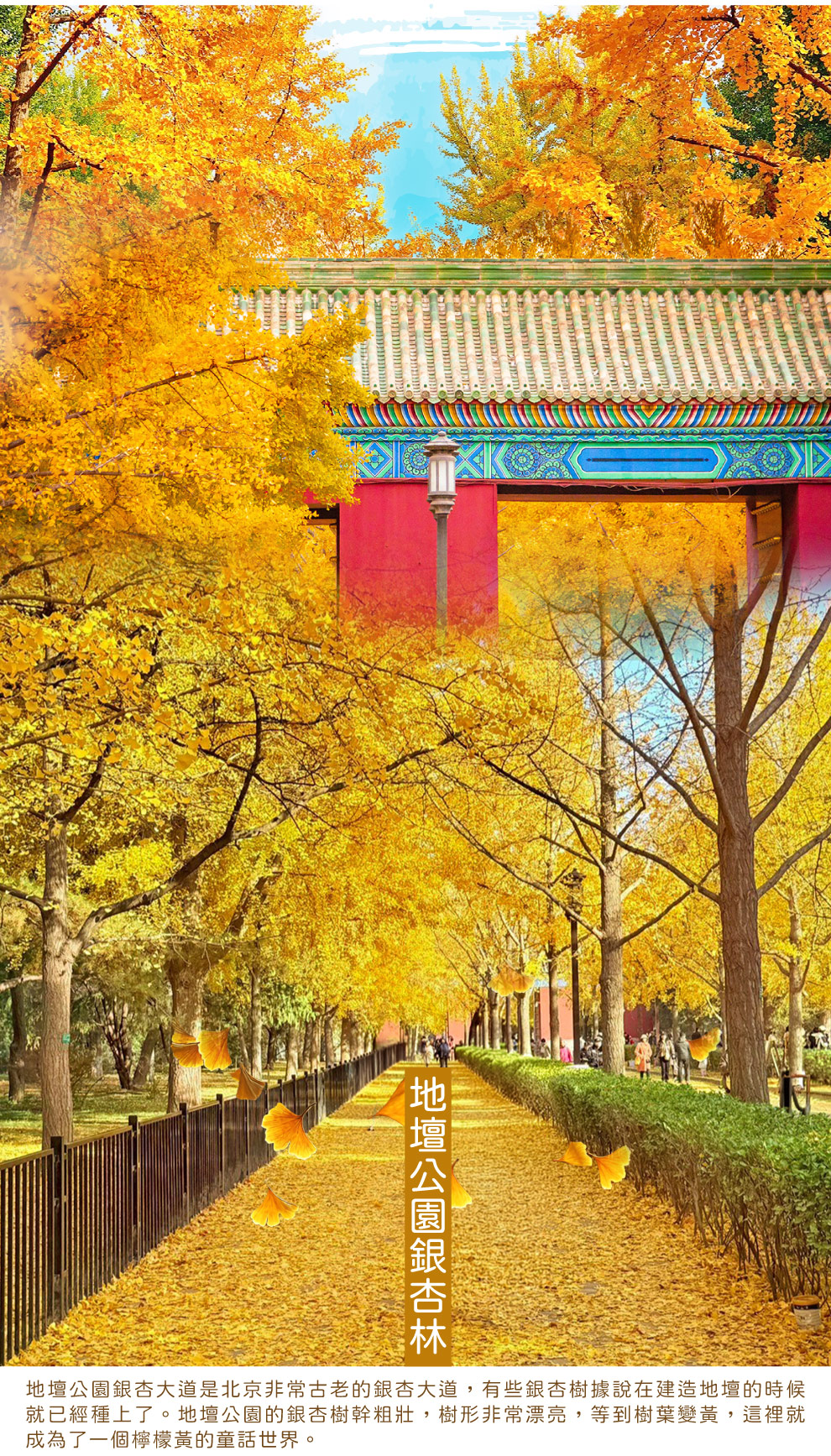 【釣魚台銀杏大道】是北京觀賞銀杏的地標性場所。該大道全長約一公里,種植有近千棵高大挺拔的銀杏樹,樹齡大多超過30年,秋冬交替時節形成金色景觀長廊,每年10月下旬至11月上旬進入最佳觀賞期。