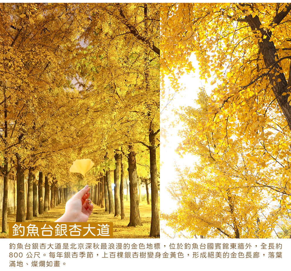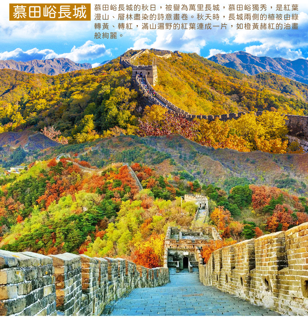 懷柔→慕田峪長城(纜車上下+接駁車)-賞紅葉彩林→釣魚台銀杏大道→特別安排舒緩身心暖心時光