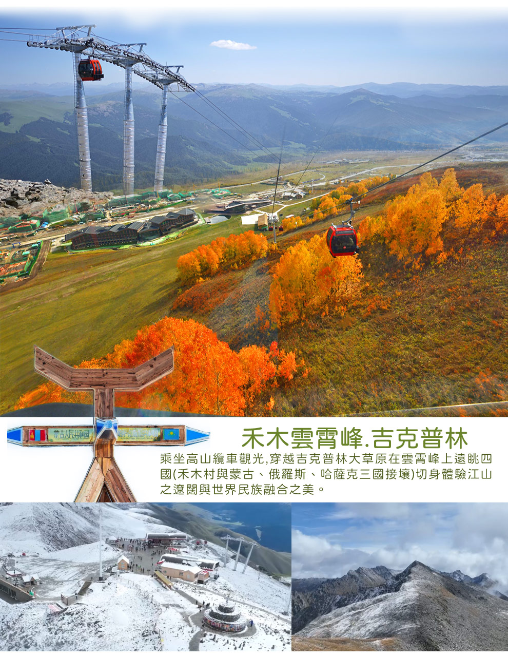 【禾木雲霄峰~含纜車】乘坐高山纜車觀光,穿越吉克普林大草原在雲霄峰上遠眺四國(禾木村與蒙古、俄羅斯、哈薩克三國接壤)切身體驗江山之遼闊與世界民族融合之美。