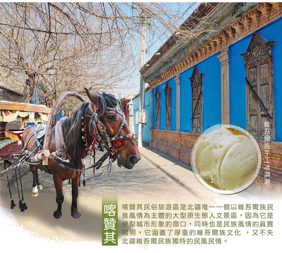 【喀讚其民俗村(馬車+品嘗冰淇淋)】新疆伊寧市喀贊其民俗旅遊區是北疆唯一一個大型原生態以反映維吾爾族風情為主的人文景區,她是伊犁城市形象的視窗,也是民族風情的生動寫照。是一個擁有深厚歷史文化和豐富自然景觀的地方,更是伊犁州的一顆璀璨明珠,它以獨特的民俗風情和古樸的建築風格吸引著成千上萬的遊客。
