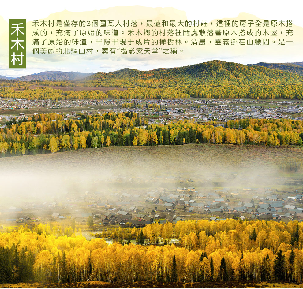 【禾木村】禾木村2005年被《中國國家地理雜誌》評選為中國最美的六大鄉村之一。秋天的金黃燦爛、雲霧飄渺中的聚落、迷人的木屋群,一幅幅美照吸引無數攝影愛好者。