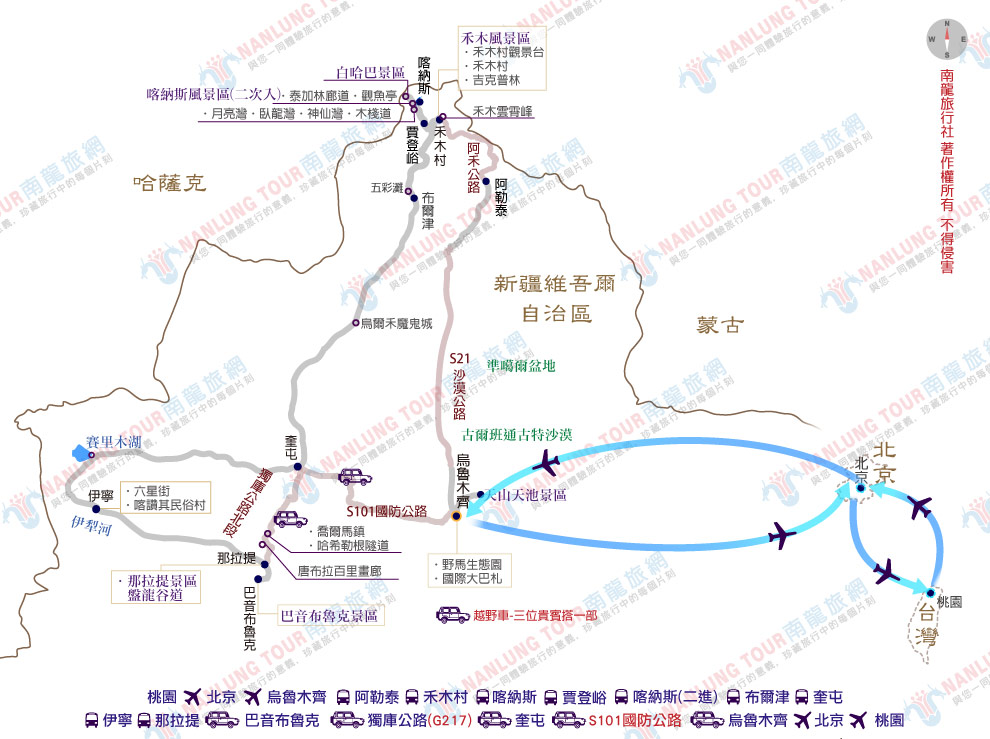 桃園→北京→烏魯木齊 (此為參考航班,航空公司/航班/時間可能會有所變動。正確搭乘航班時間,以出發前最終確認為主)